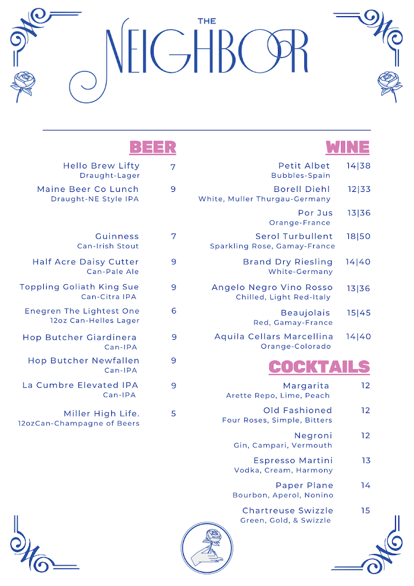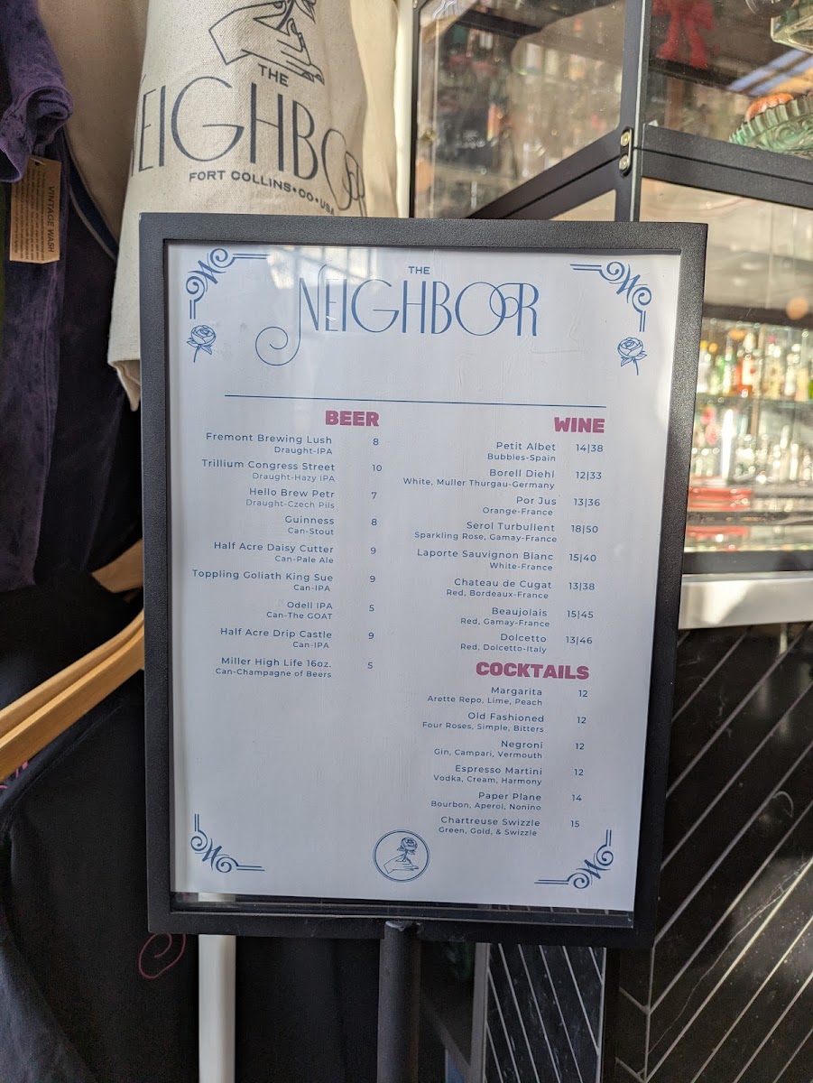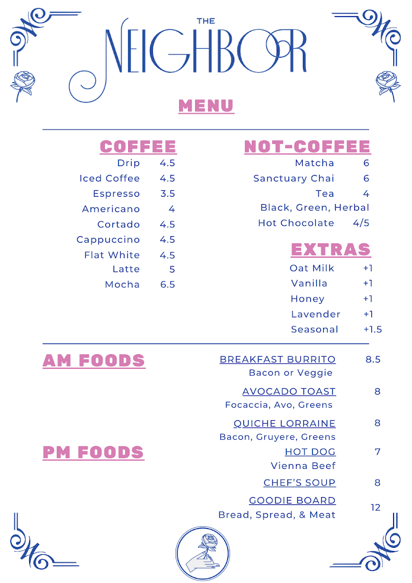 The menu at The Neighbor offers a selection designed to accommodate various times of day, including breakfast, coffee breaks, and casual dining. It features a broad range of beverages alongside light food options, suitable for quick orders or relaxed visits.
